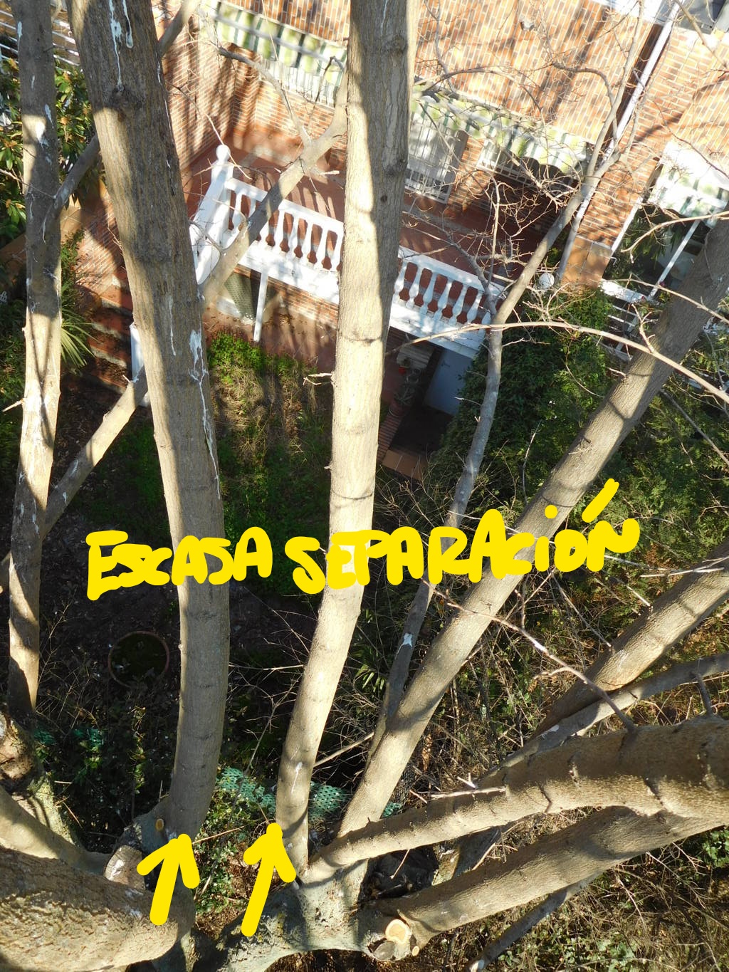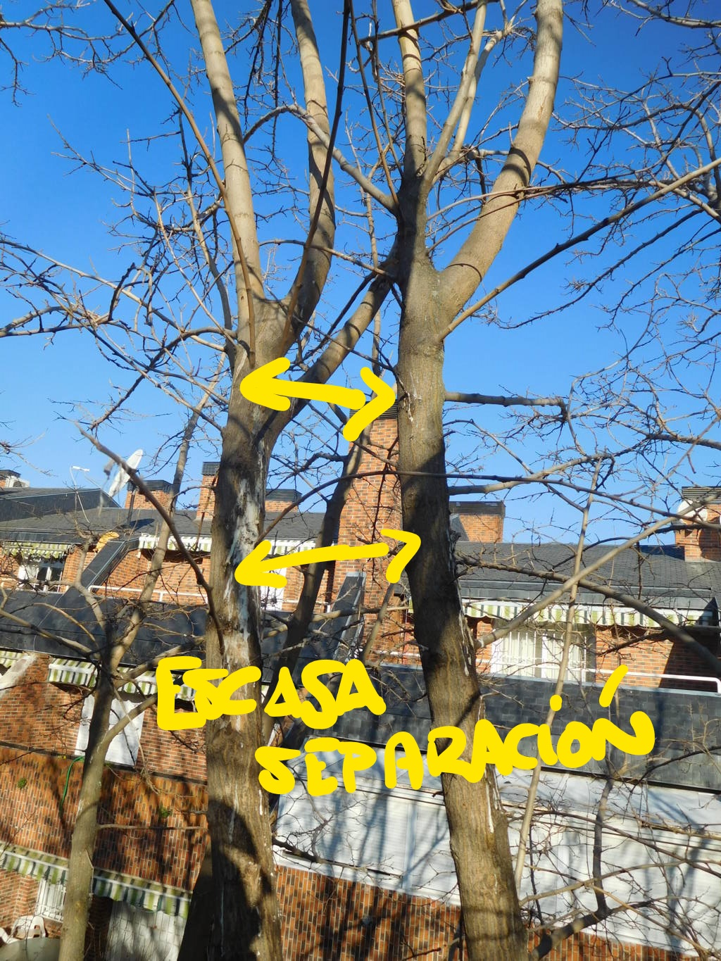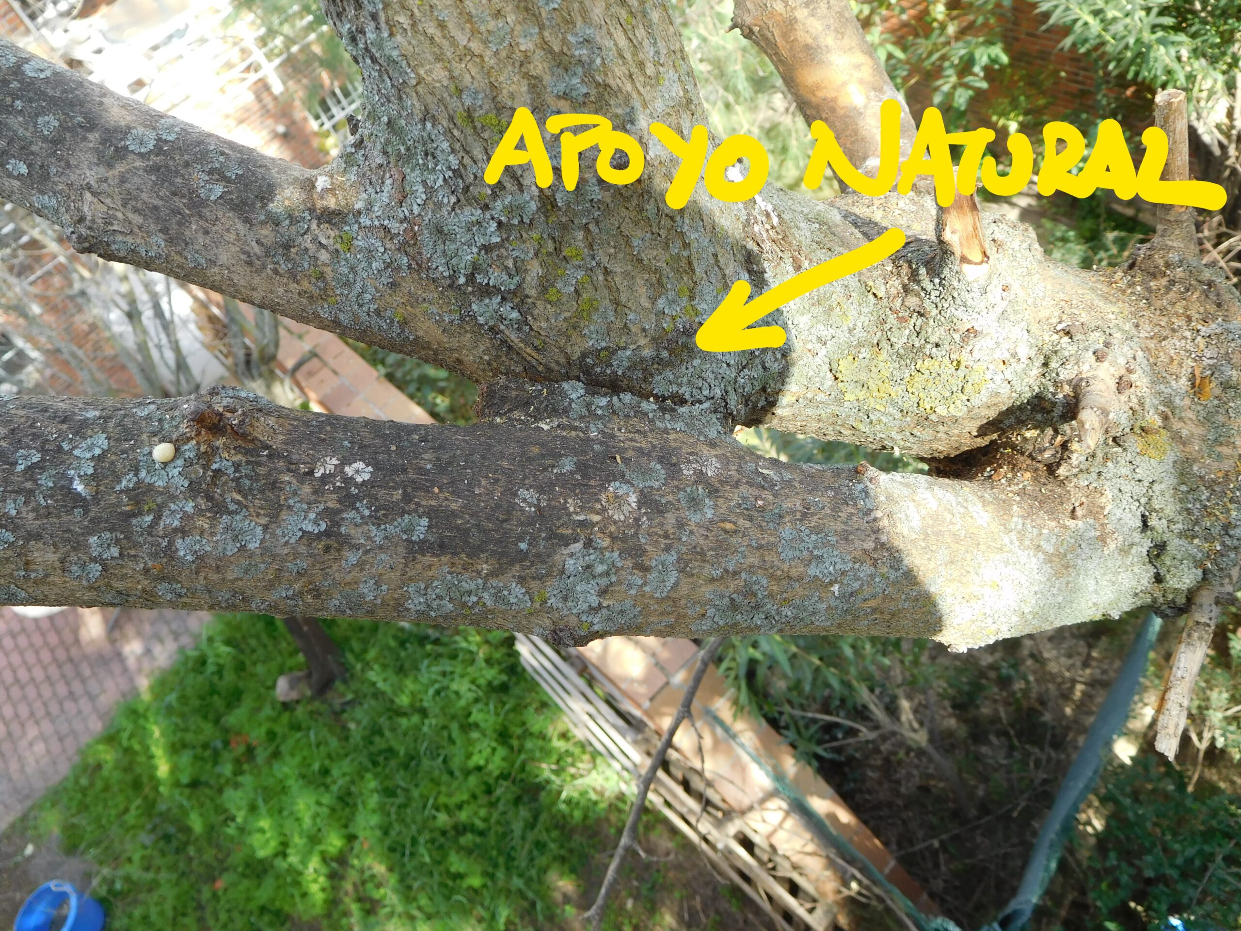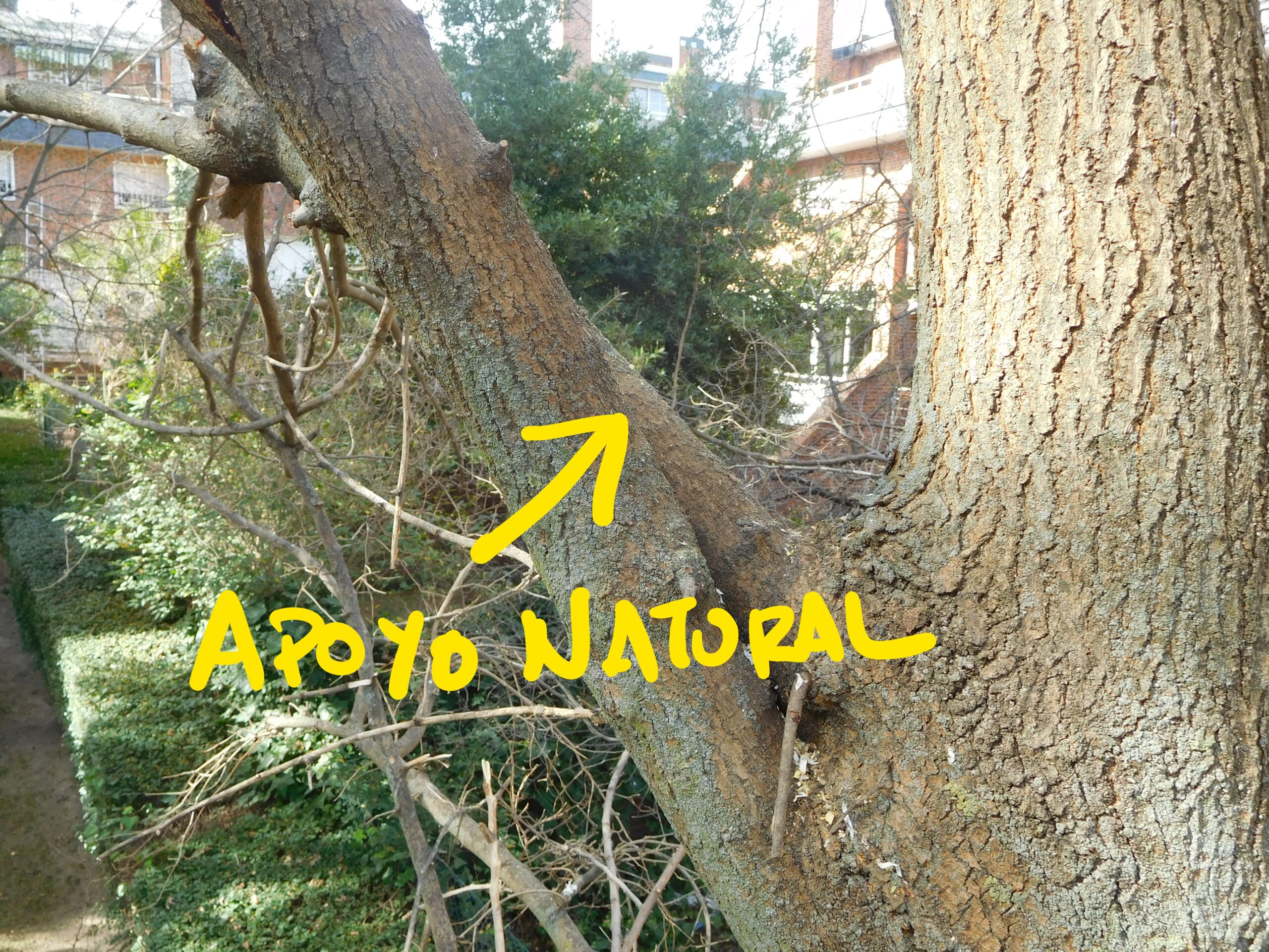 También se han respetado aquellos apoyos naturales de los ejes tras la brotación de emergencia. En algún caso que era necesaria la eliminación por excesivo ahilamiento o mala ubicación frente al conjunto del árbol, no se ha realizado el corte correcto en la unión de la rama tras su eliminación. Se ha respetado aquella zona que sostiene (apoyo natural) de forma natural a otro eje para evitar la rotura de la rama por falta de apoyo. Tras un período de adaptación pudiera ser posible su eliminación.